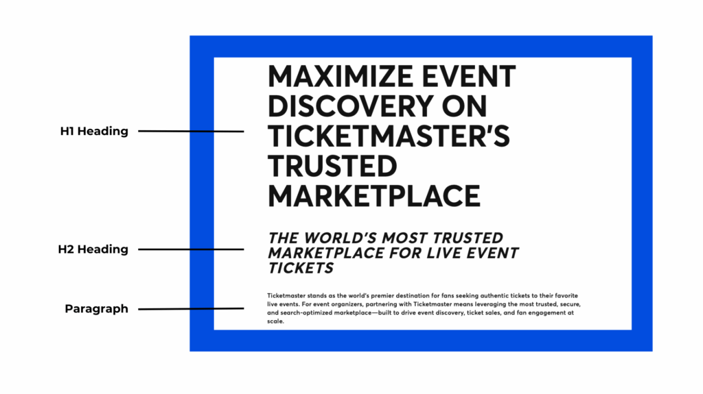 - Page Title: Keep it under 60 characters and include your primary keyword, event name, and location. For example, “Halsey at The O2 Academy Brixton: Official Tickets.”