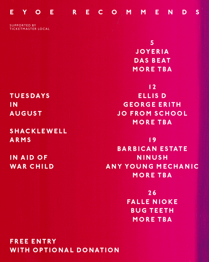 Ticketmaster Local has partnered with Eat Your Own Ears on a new live music series taking place throughout August at the Shacklewell Arms in East London. The Eat Your Own Ears Recommends series will spotlight emerging artists across four consecutive Tuesdays, with all donations from the events going directly to War Child.